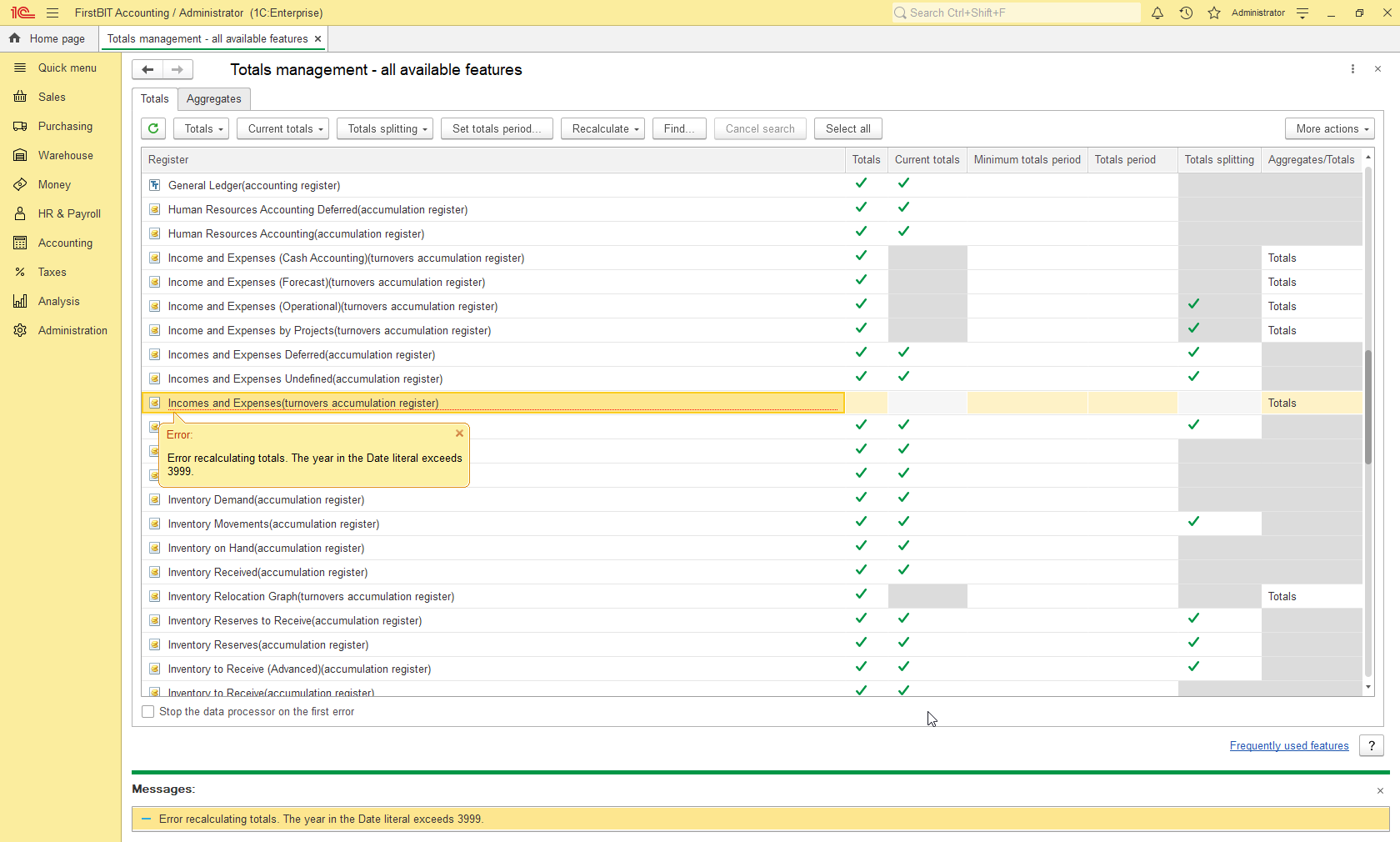 So, during a routine totals recalculation from the Configurator, we suddenly got the error: "the year in the Date literal exceeds 3999". Which means there's a date somewhere in the database — or trying to get there — that is beyond the maximum 1C can handle: 31.12.3999 23:59:59.